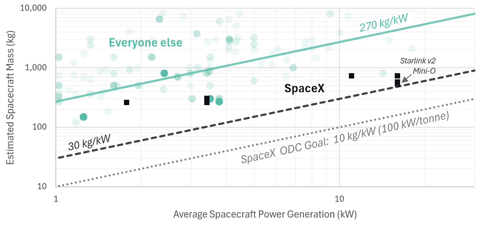 Elon Musk has claimed that SpaceX will achieve 100 kW/tonne all-in for orbital data centers (10 kg/kW for the entire spacecraft in our modeling convention). As the relative benchmarks suggest, today this barely covers the mass-per-power of the compute, let alone an entire spacecraft with massive record-breaking solar arrays.