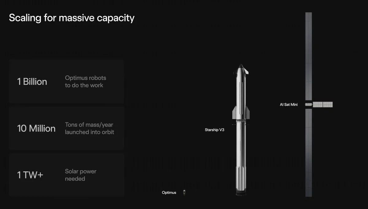 Figure 8. SpaceX unveiling an unfurled AI Sat Mini compared to Starship V3 as the basis of near-term orbital data center compute.